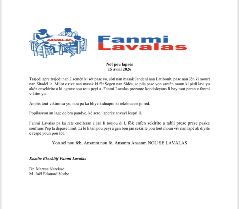 Dans une note publiée le 15 avril 2026, le parti politique Fanmi Lavalas exprime sa vive inquiétude face à la multiplication des actes de violence enregistrés à travers le pays au cours des dernières semaines.
